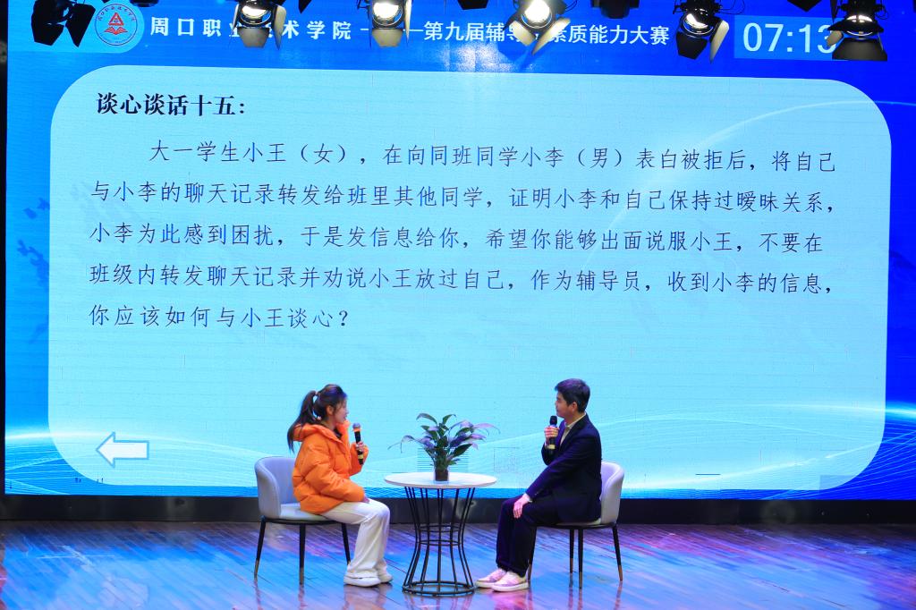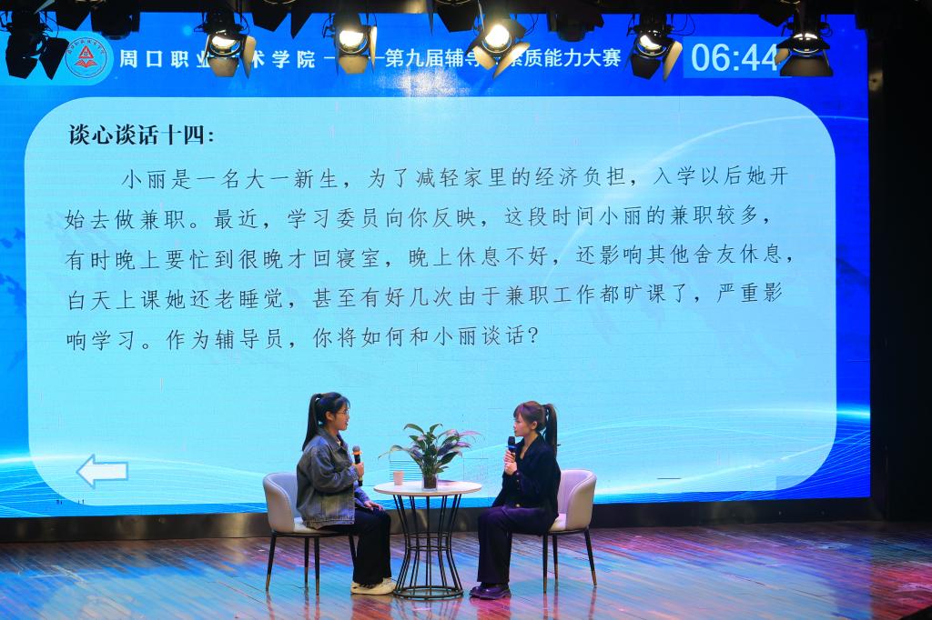 本次大赛分为三个比赛环节分别是“基础知识测试”、“案例研讨”、“谈心谈话”。比赛内容涵盖广泛,都紧扣校园生活中的事实案例,不仅考验了辅导员应对突发情况时灵活应变的处理能力,还展现了辅导员们丰厚的知识底蕴。