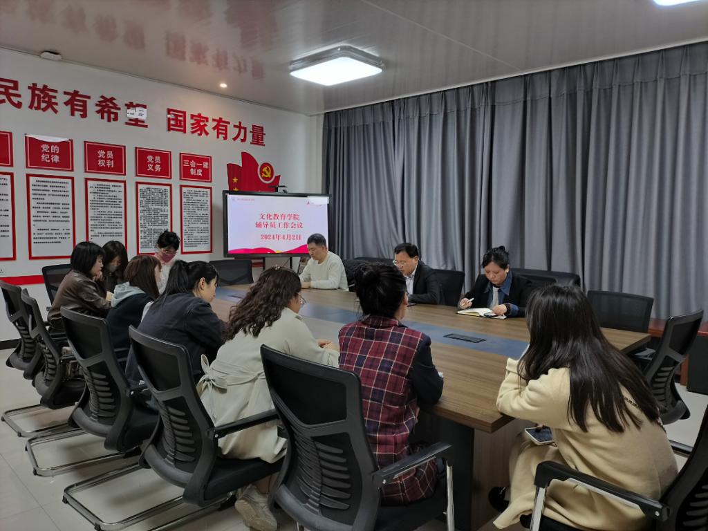 为进一步提升辅导员的工作技能、工作效率及假期学生安全问题,确保学院各项工作顺利开展,文化教育学院于4月2日在五区党员活动室召开辅导员工作会议,党总支书记展贤东,副院长于慧娟,学管办主任普俊及各班辅导员参加本次会议。