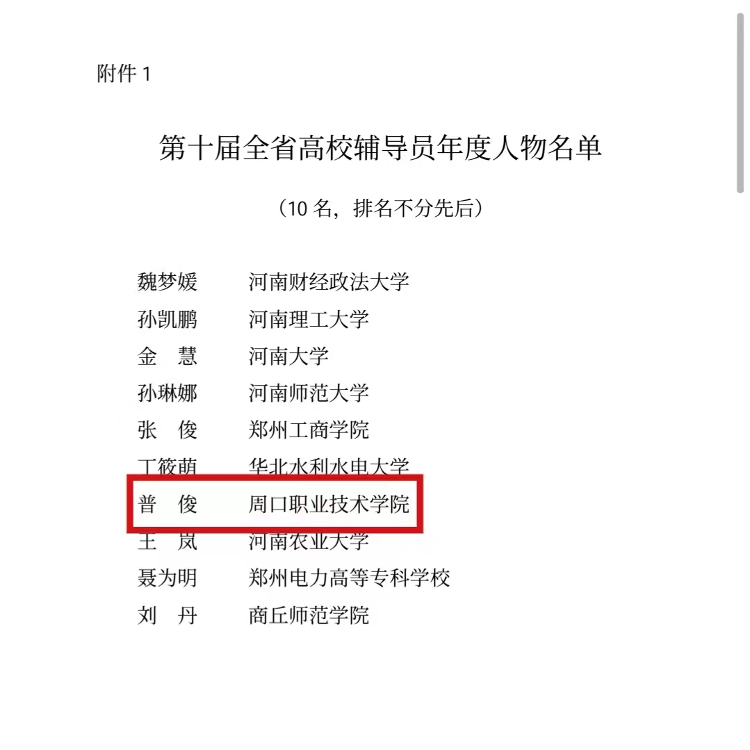 日前,由中共河南省委教育工委河南省教育厅组织开展的“第十届全省高校辅导员年度人物”评选活动揭晓,我院普俊老师荣获“第十届全省高校辅导员年度人物”称号,这是我校参加该项评选活动获得的最高荣誉,也是周口市高校唯一获此殊荣的辅导员。