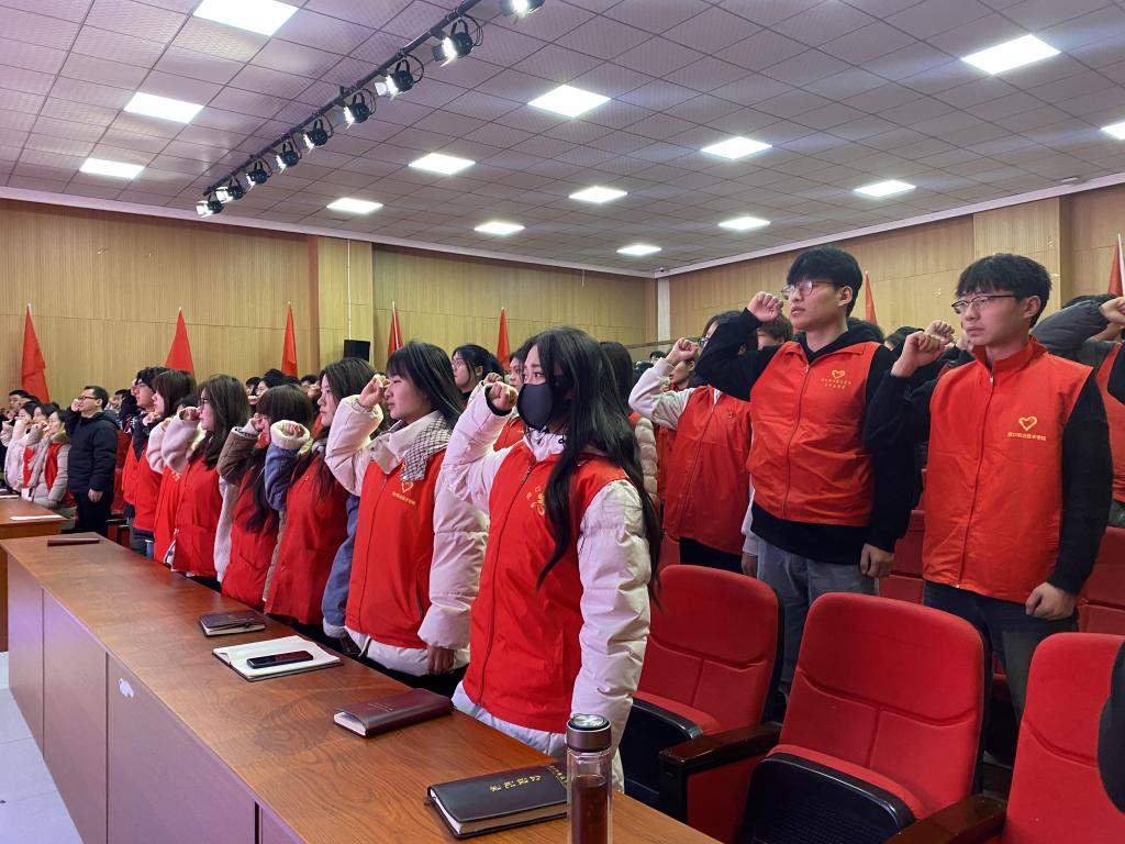 在领誓人郭启航同学的带领下,在场全体青年志愿者举起右拳,庄严宣誓,神情专注,传递出对志愿服务的热忱与坚定,他们铿锵有力的誓言久久回荡在学艺演播厅内。