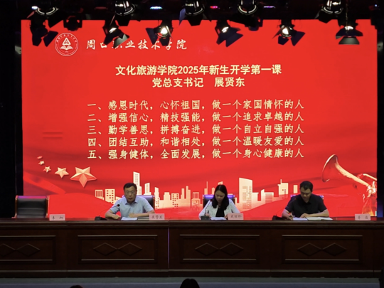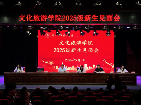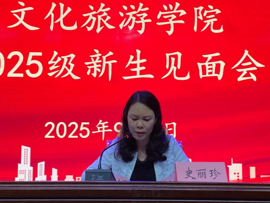 史丽珍首先向2025级新生文旅学院的基本情况、专业设置、师资力量。对新生提出三点期望:一是在培树家国情怀中强化自我审视,把握时代需求,明确自身使命;二是在不断汲取知识中提高应用能力,钻研专业知识、开阔视野,培养多元思维,做到学以致用;三是在努力拼搏进取中勇于突破自我,适应大学生活、转变角色,树立更高奋斗目标。